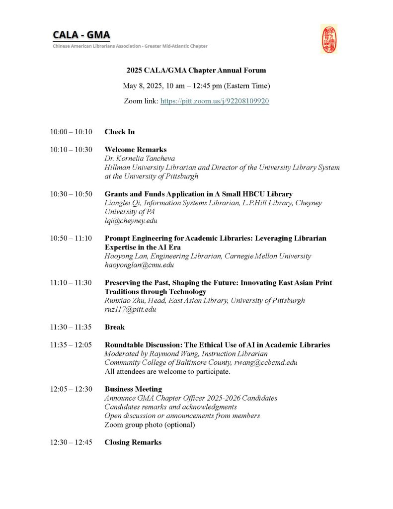 Chinese American Librarians Association Greater Mid-Atlantic Chapter (CALA-GMA) Annual Forum 2025 will be held on May 8th, 2025 via Zoom. Please see below the full agenda.